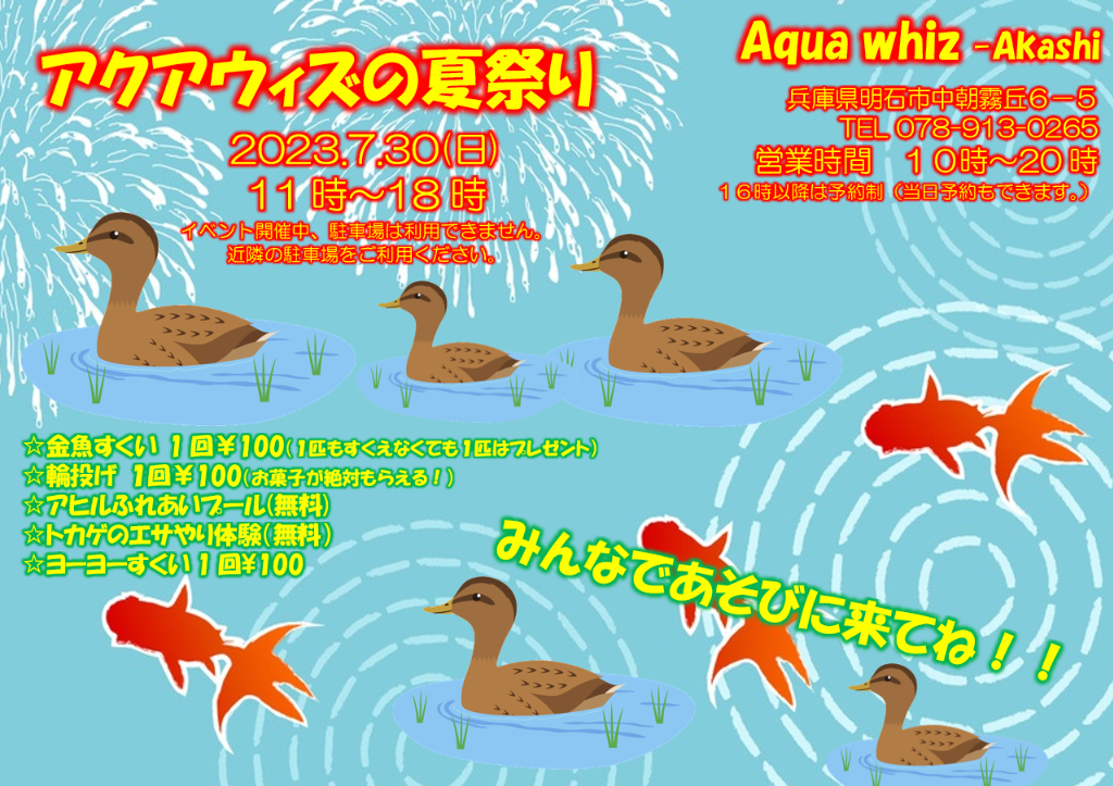2023年7月30日(日)11時~18時☆金魚すくい 1回100円(1匹もすくえなくても1匹はプレゼント)☆輪投げ 1回100円☆ヨーヨーすくい 1回100円☆アヒルふれあいプール (無料)☆トカゲの餌やり体験 (無料)※イベント開催中、駐車場は利用できません。近隣の駐車場をご利用ください。
